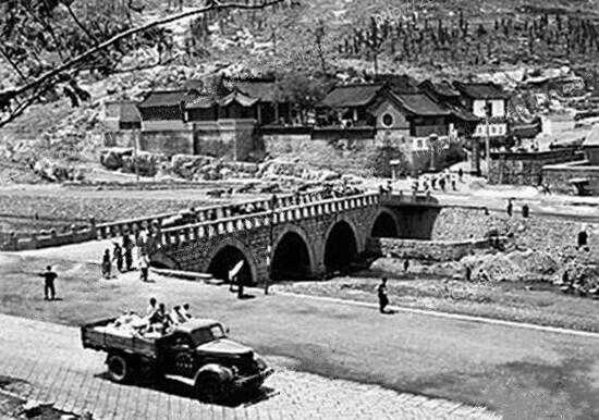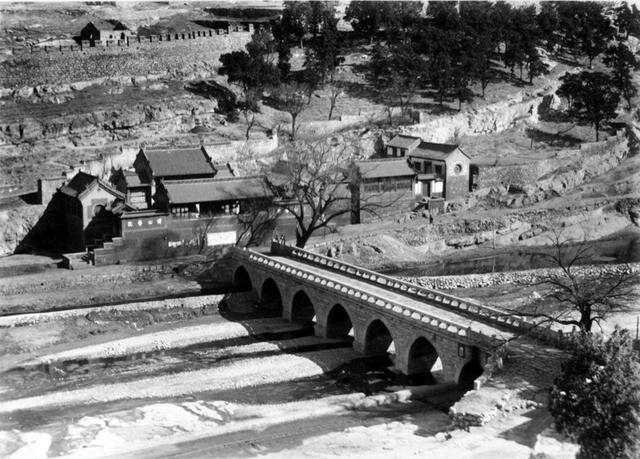 细看齐长城,从山上之字形到达红门庙,七孔桥,这应该是最早一张七孔桥的照片。桥下北边第七孔下,还有小火车的铁道路基,南岸墙下还能看到老石牛的样子,红门庙现在正好少了一半。