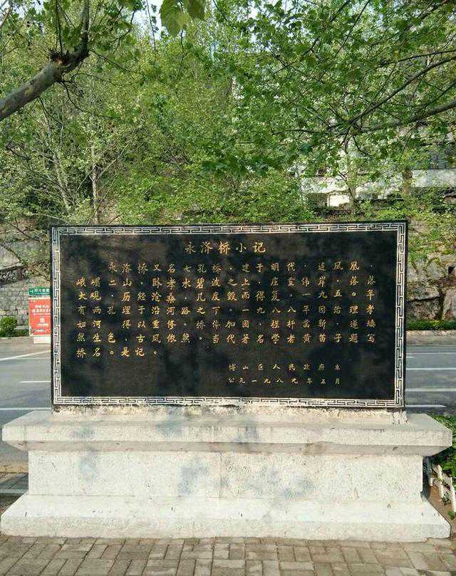 永济桥又名七孔桥,建于明代,连凤凰、峨嵋二山,卧孝水碧波之上,庄重伟岸,落落大观,历经沧桑,几度毁而得复。1950年有两孔埋于沿河路之下。1988年因治理孝妇河,得以重修。桥体加固,栏杆凿新,遂焕然生色,古风依然。当代著名书法家黄苗子题写桥名,是记。