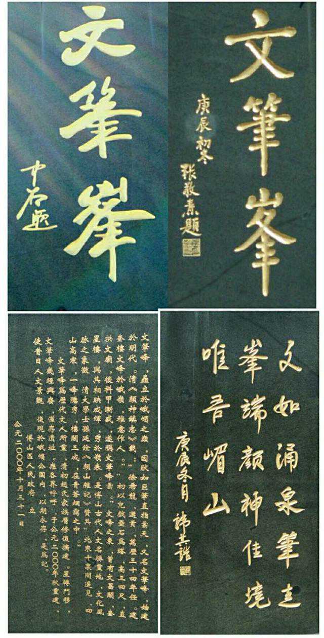 文笔峰因形状如笔,直冲蓝天,为历代文人所重,是博山文化风脉之象徽。几经兴废,仅存遗址。2000年博山政府重建。