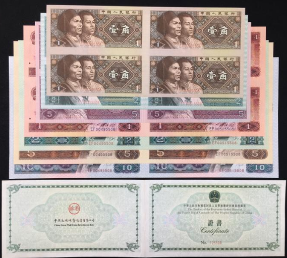 长城小四连是第四套人民币1角到10元的四连体,发行时间是2001年,面值为75,2元,发行量为20万套,发行之初价格大概在200元左右,去年市场价格高一点在5000元左右,今年价格稍微有些回落,价格在4000元左右。
