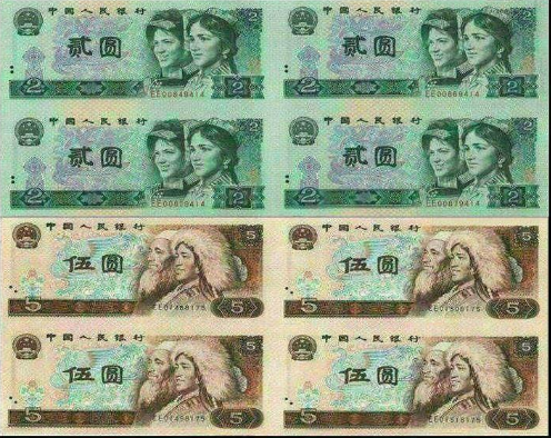 2元5元四连体发行于2001年,总共面值36元,两元有两张,分别为80版和90版,5元为80版。发行数量为40万套,发行之初价格大概在60多元,目前市场价格在2200元左右。