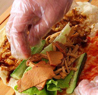 将炸好的饼刷上一半黑酱,刷一半茄汁,放适量青瓜少量葱丝,加入主料,卷至一半的时候从后面折一点。卷成细卷,加上卷饼纸。