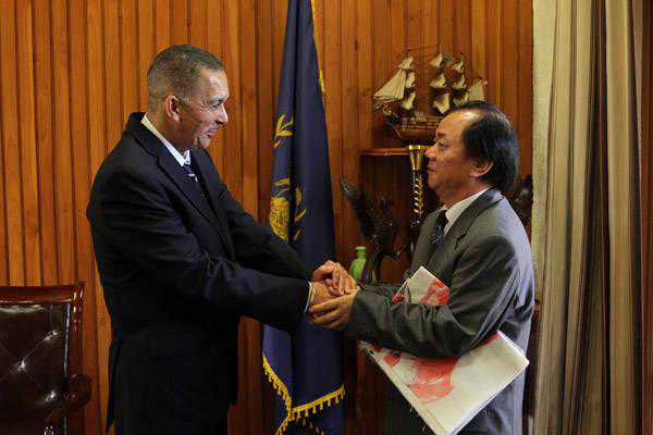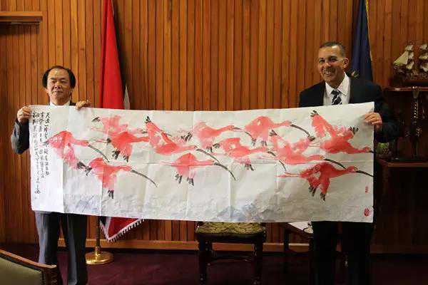 (赵言斌作品“红鸟”“特多国家国鸟”被特多国家总统“卡莫纳”收藏)