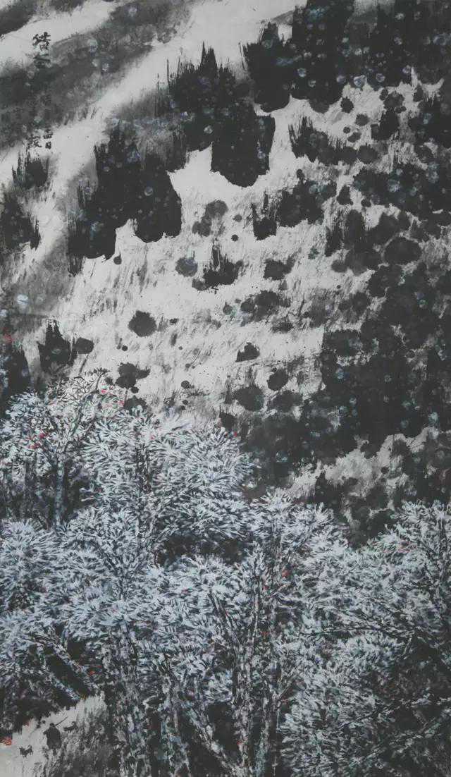 赵言斌现在画的明显比过去慢了。中国画的构成原则是重写意而非重写实,是重表现而非再现。十上黄河石林写生,六登武夷山采风。为的是眼前的河流山川模糊.淡化.隐去,入画的千山万水一定要是画家依据印象重新构建而成的。他把古人对自然对物事长时间凝视,变为心灵的走近和聆听。宣纸为画家拓展了充足的发挥天地,于是投入创作时,他不仅可以象宋人那样以笔墨图“形”,象元人那样以笔墨写“心”,还可以用笔墨描绘出“超现实”,节奏.色彩.韵味。即使一棵树,在赵言斌在意识图景里都可以有数百种表达。画家只有穿透现象的遮蔽,洞察事物的本质,作品才能显示出艺术家特有的情怀和境界。美,是个人的,艺术不分派,它是很微妙的一种个人情感的表达。