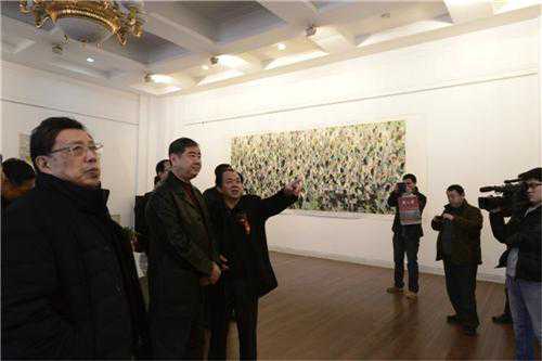 2013年12月8日在山东省美术馆举办《农人梦—赵言斌画展》,时任省委副书记王军民观看画展。(左一为刘长锁,山东省政府参事,曾任山东省招远市第一任市委书记)