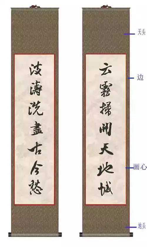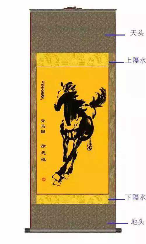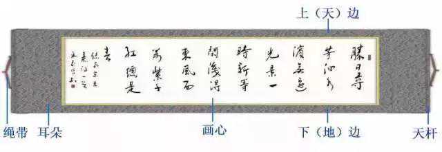起初“惊燕带”不贴实,能飘动,后贴实,纯为装饰。“画心”上下端可加镶锦条,称“锦眉”,亦称“锦牙”。悬挂在厅堂正中的大副字画还称“中堂”。