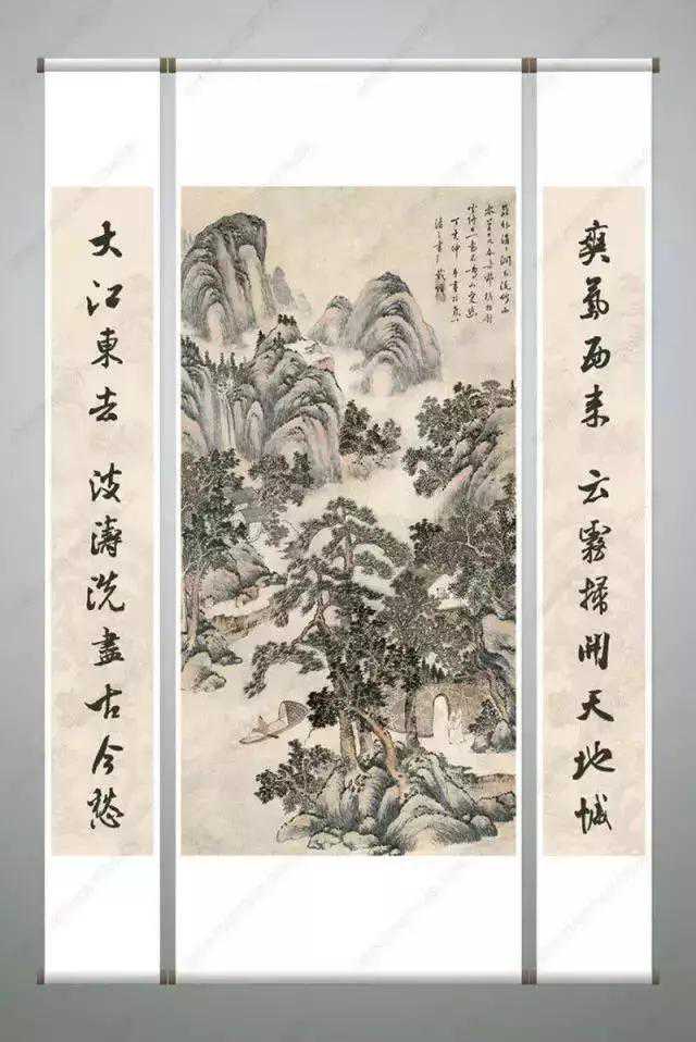 立轴(上图),主要用于竖式构图,悬挂欣赏。画幅的上下左右常常有文人或收藏家题字赞赏。中间部分称“画心”,上有“诗塘”、“天头”,下是地脚。上下又有“隔水”,有的天头贴“惊燕”。