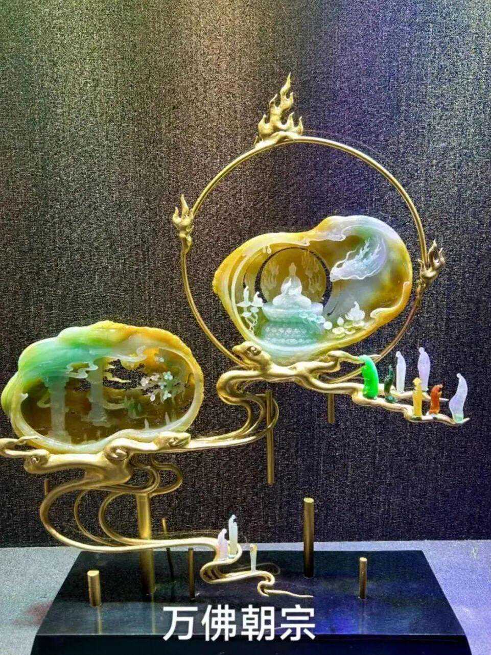 千年古刹静立于巍峨群山之巅,明月如盏高挂天空,照亮古老的庙宇,投下一片神秘的宁静。这里清幽的氛围与信徒们热诚的信仰形成鲜明对比,仿佛是一场时空交错的仪式。2023年“玉华杯”玉石雕刻大赛上,一件名为《万佛朝宗》的作品脱颖而出,由翡翠、程相海、杨小闪、紫双、李小闪联袂创作,夺得银奖。这件作品不仅是一次对信仰的致敬,更是艺术与灵感的完美结合。