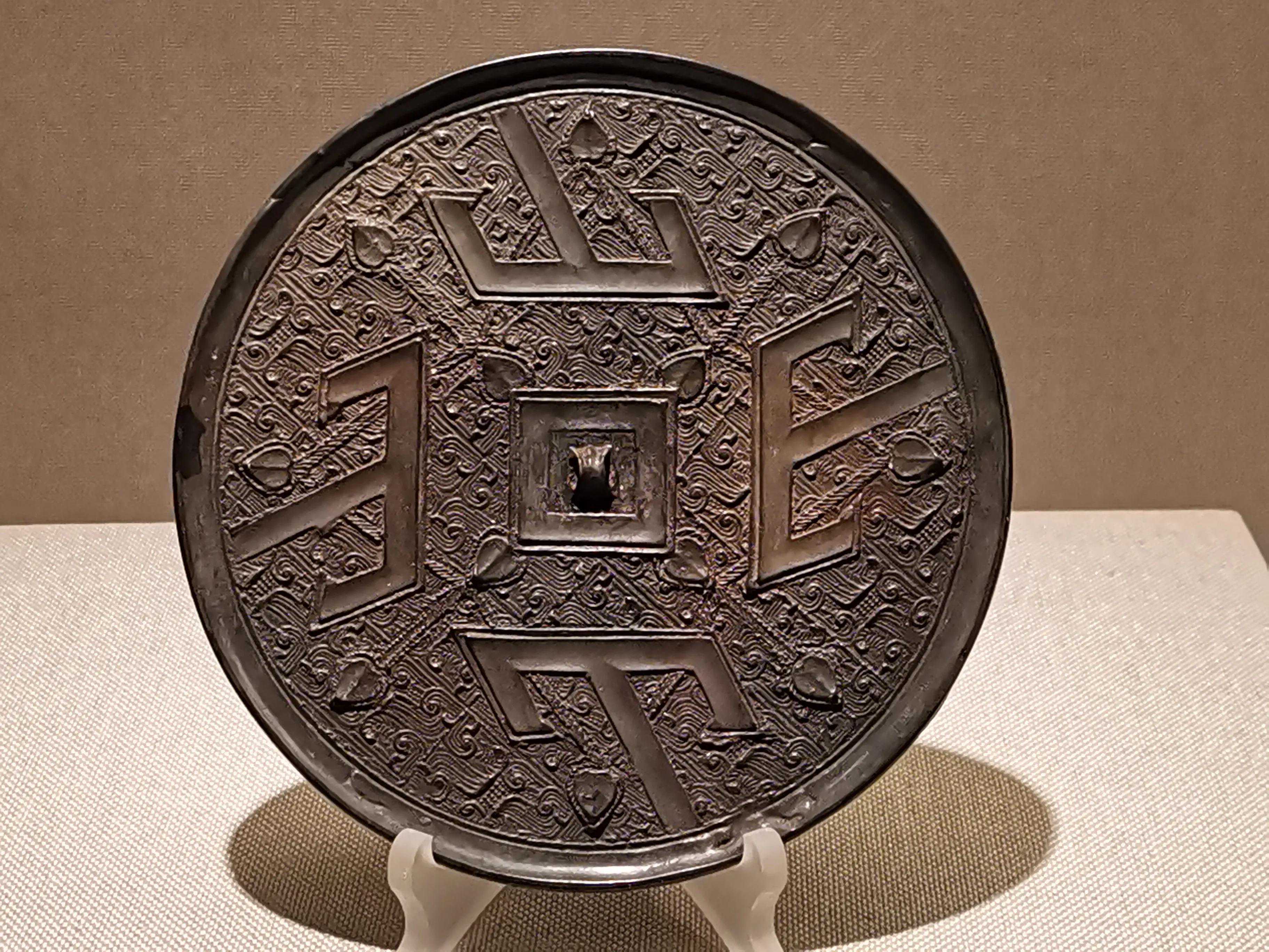铜镜制作发展到战国形成了第一次高峰。纹饰由单纯素面或几何纹样发展到蟠虺纹、云雷纹、山字纹等多种式样。纹饰构建上也由纯地纹发展到有主纹与地纹之别的多层纹饰构成。同时,透雕合铸、错金银、镶金嵌玉工艺在铜镜上的应用是这一高峰期形成的标志。其中山字纹镜通常是在羽状地纹上饰“山”字形图案,可分三山镜、四山镜、五山镜、六山镜等,其中以四山纹镜最为常见,流行于战国早中期,以湖南地区出土数量最多。“山”形纹饰多认为是青铜器勾连雷纹的省略变形。