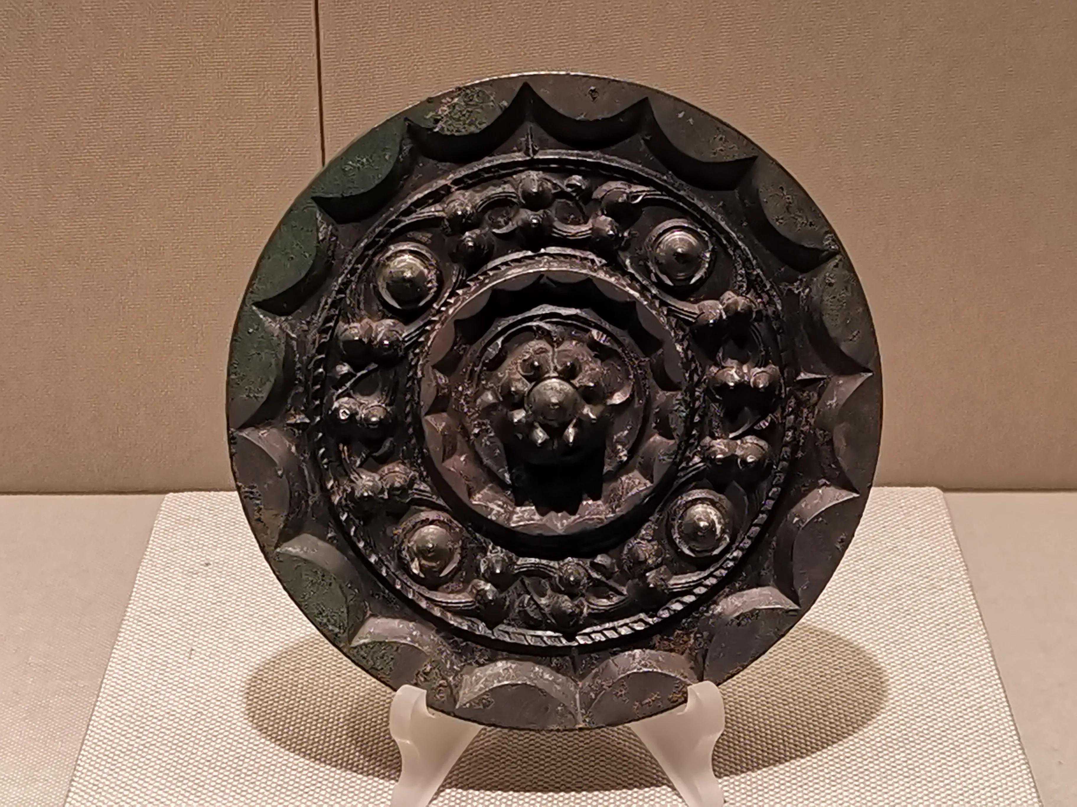 辽镜承继汉、唐镜遗风,又吸收宋镜风格,有其独到之处。如典型的龟背纹镜,采用方圆结合、层层分割、曲直相形的图案,形成独特的四合纹样。龙纹镜以其刚健犀利的细线刻技法,带来高超的艺术表现能力。菊花纹镜,更多地吸收了宋镜缠枝花草的韵味,细腻、柔美而雅致,更以其花形的镜形,达到镜、花合一的艺术效果。辽代铜镜中的迦陵频伽纹镜独具特色,迦陵频伽是佛教故事中的神鸟,人头鸟身,译名美音鸟或妙声鸟。铜镜出土于辽宁省建平县张家营子乡勿沁吐鲁村辽墓,以圆润柔和的凸线勾画迦陵频伽,空白处以花叶补满。以佛教故事作为纹饰题材,反映了佛教在辽代的深远影响。