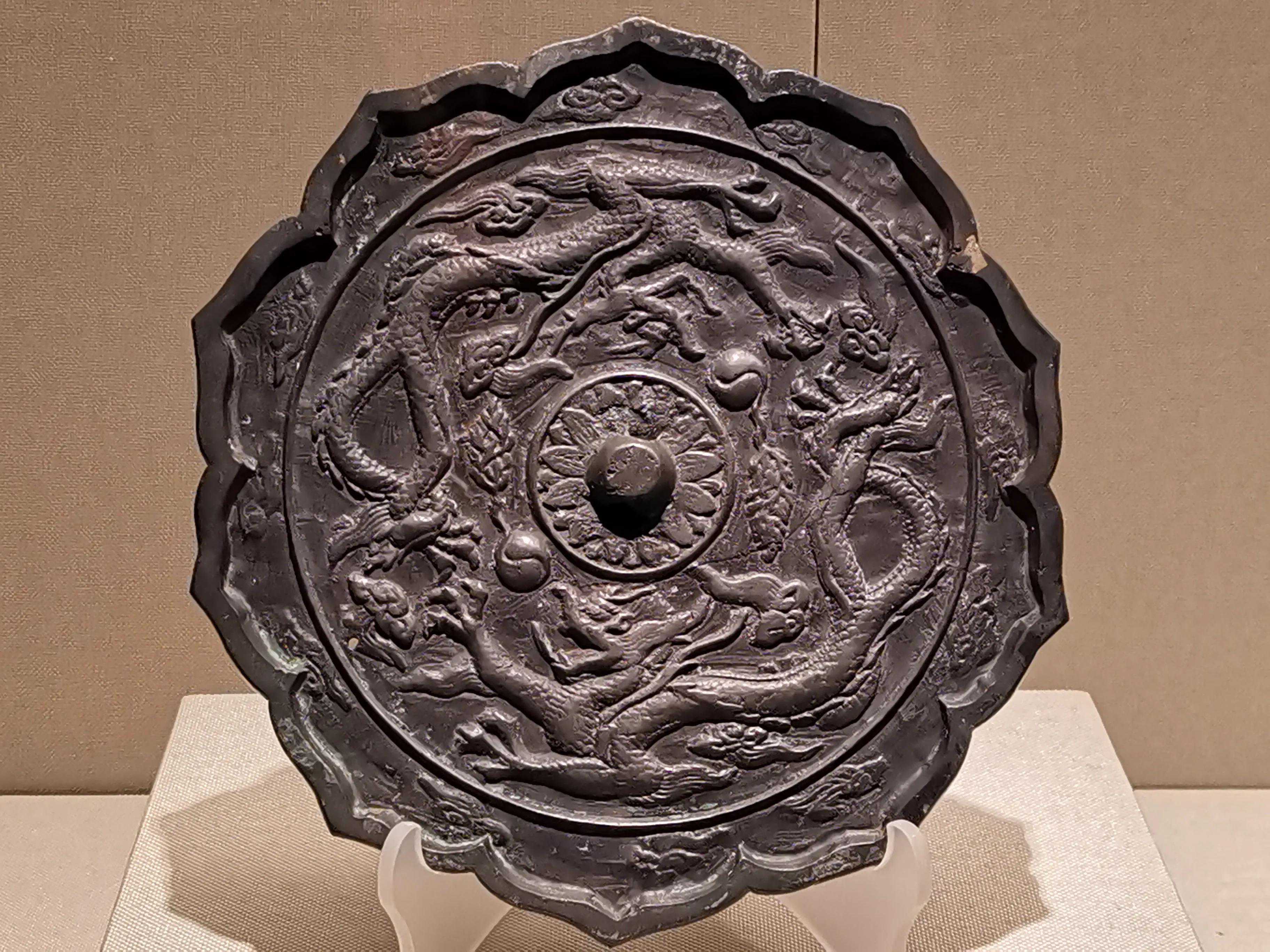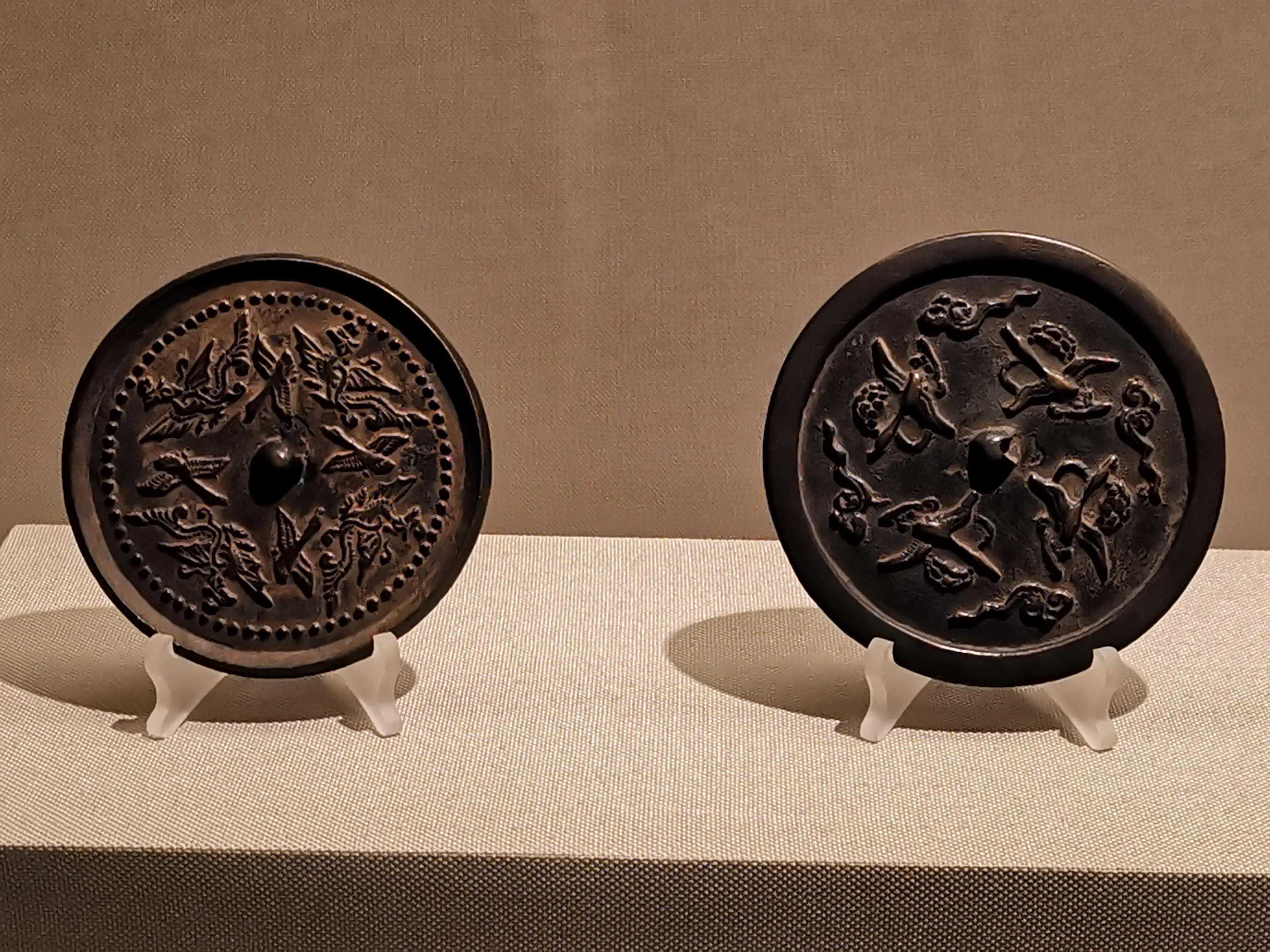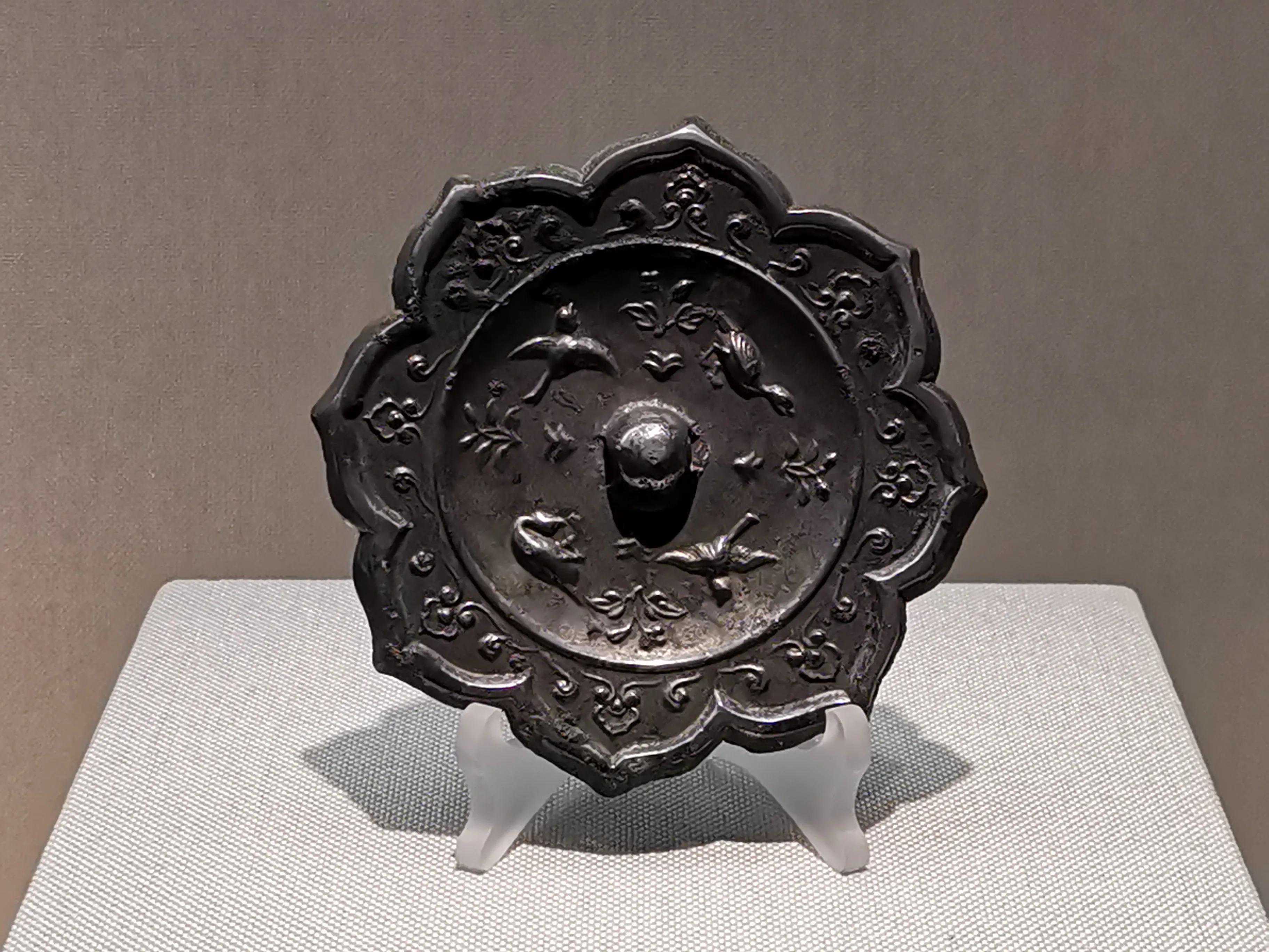 唐代铜镜不仅突破了之前以圆为主的形式,出现了菱花、葵花、方形、亚形镜,而且纹饰也突破了汉镜的刻板及图案化,布局灵活多样,题材丰富多彩,且有异域人文色彩。花鸟菱花镜、瑞兽葡萄镜、人物故事镜等,都反映着盛唐的气派,突出一种繁荣的氛围,充满了盛唐欣欣向荣的生活气息。工艺方面还出现了金银平脱镜、螺钿镜、贴金贴银镜等,成为后世铜镜铸造所无法超越的又一个高峰。其中瑞兽葡萄纹镜又称海马葡萄镜、海兽葡萄镜、狻猊葡萄镜。流行于盛唐,多采用瑞兽、花鸟、葡萄等图案做装饰。葡萄是汉武帝时张骞出使西域带回中国,其图案已经出现在汉代丝织品上,唐代将其与瑞兽纹巧妙地结合在铜镜装饰上,突破了汉镜规矩的格局,呈现出包容万象、海纳百川的盛唐气象。唐代铜镜另一流行纹饰是双鸾镜,也称对凤镜,主题纹饰是双凤对舞,口衔绶带。绶是古代系官印的丝带,代表官秩禄位,配以吉祥的莲荷图案和具有瑞象的凤,应是世人求取功名的美好愿望。