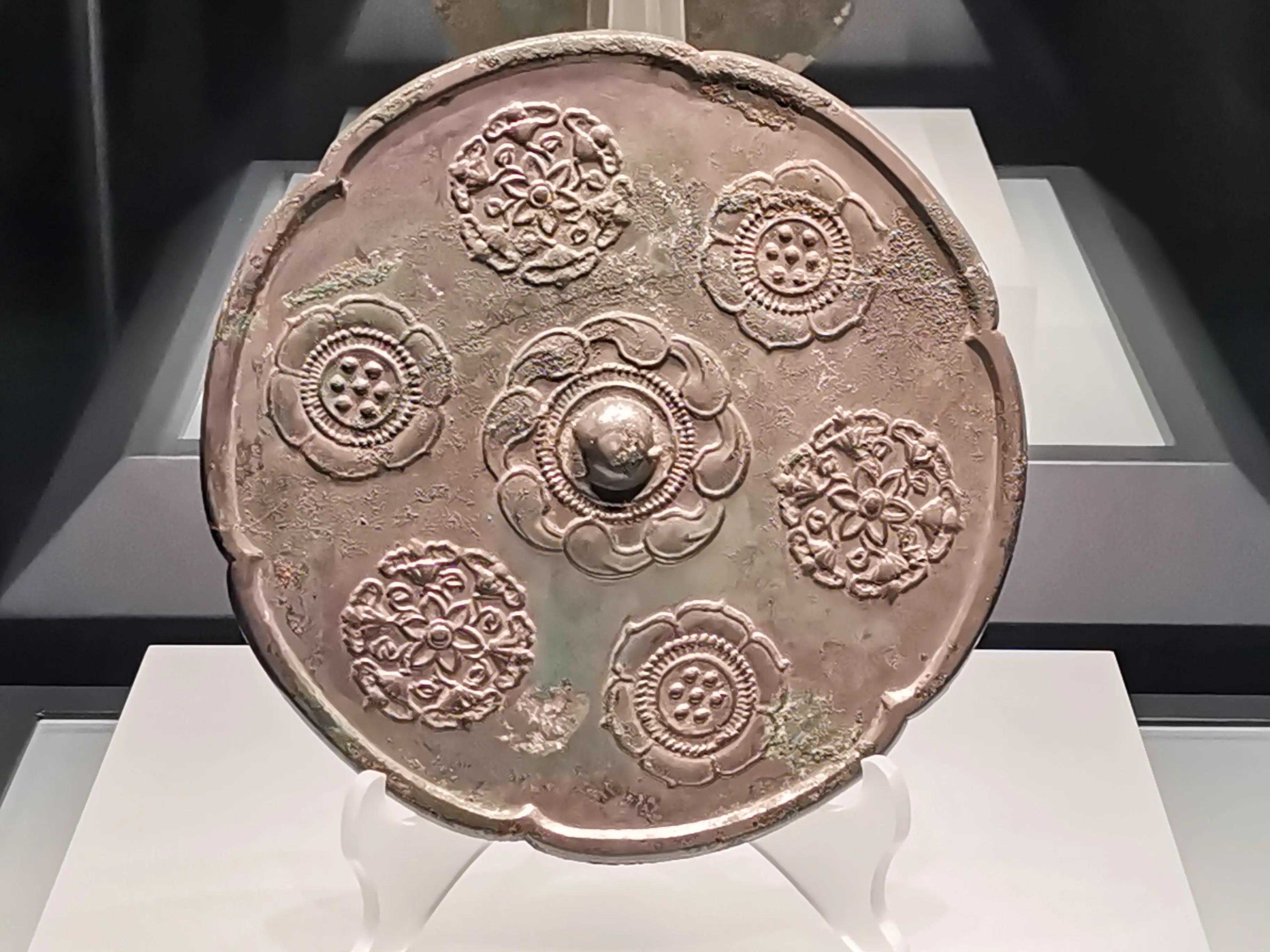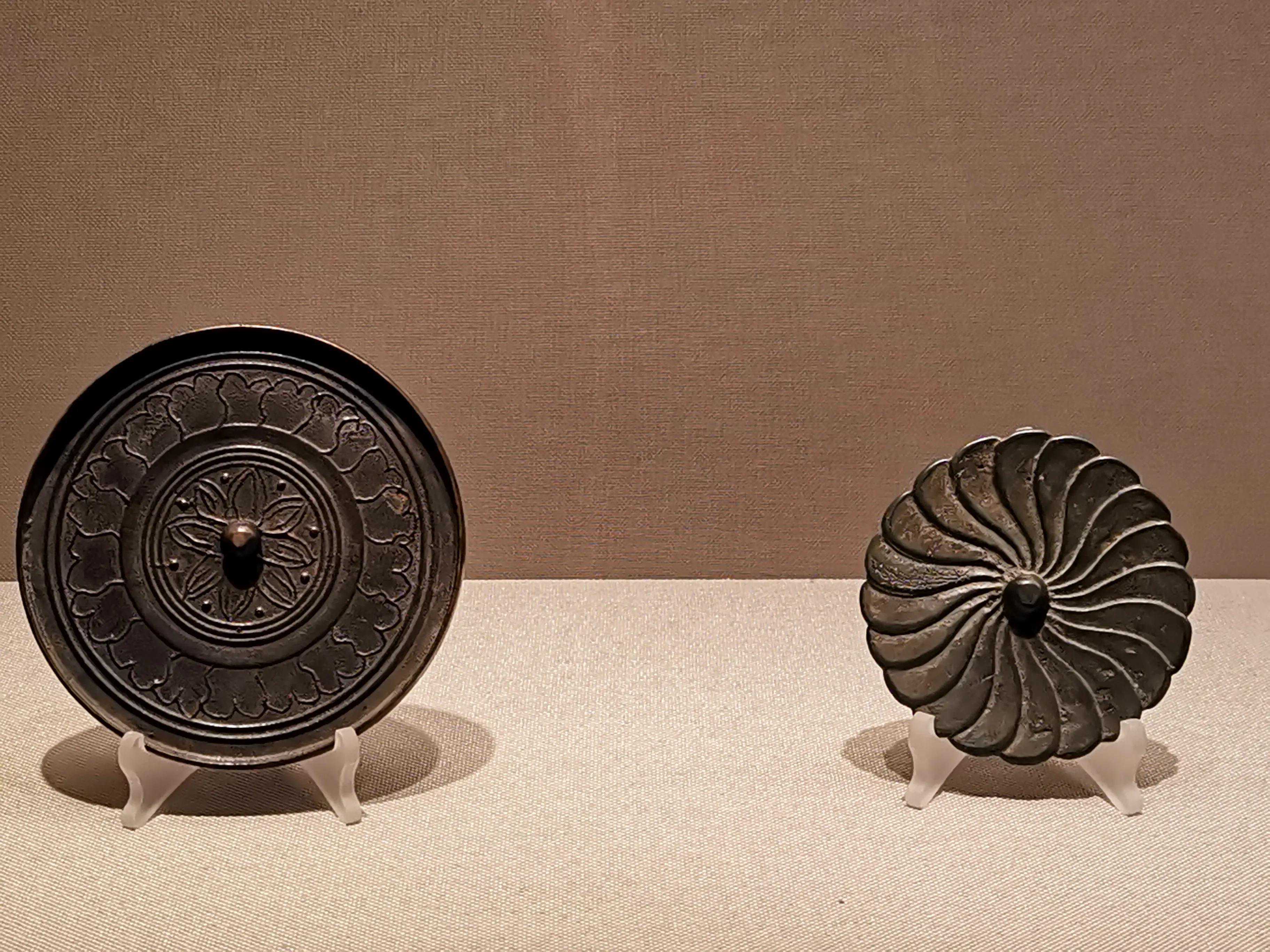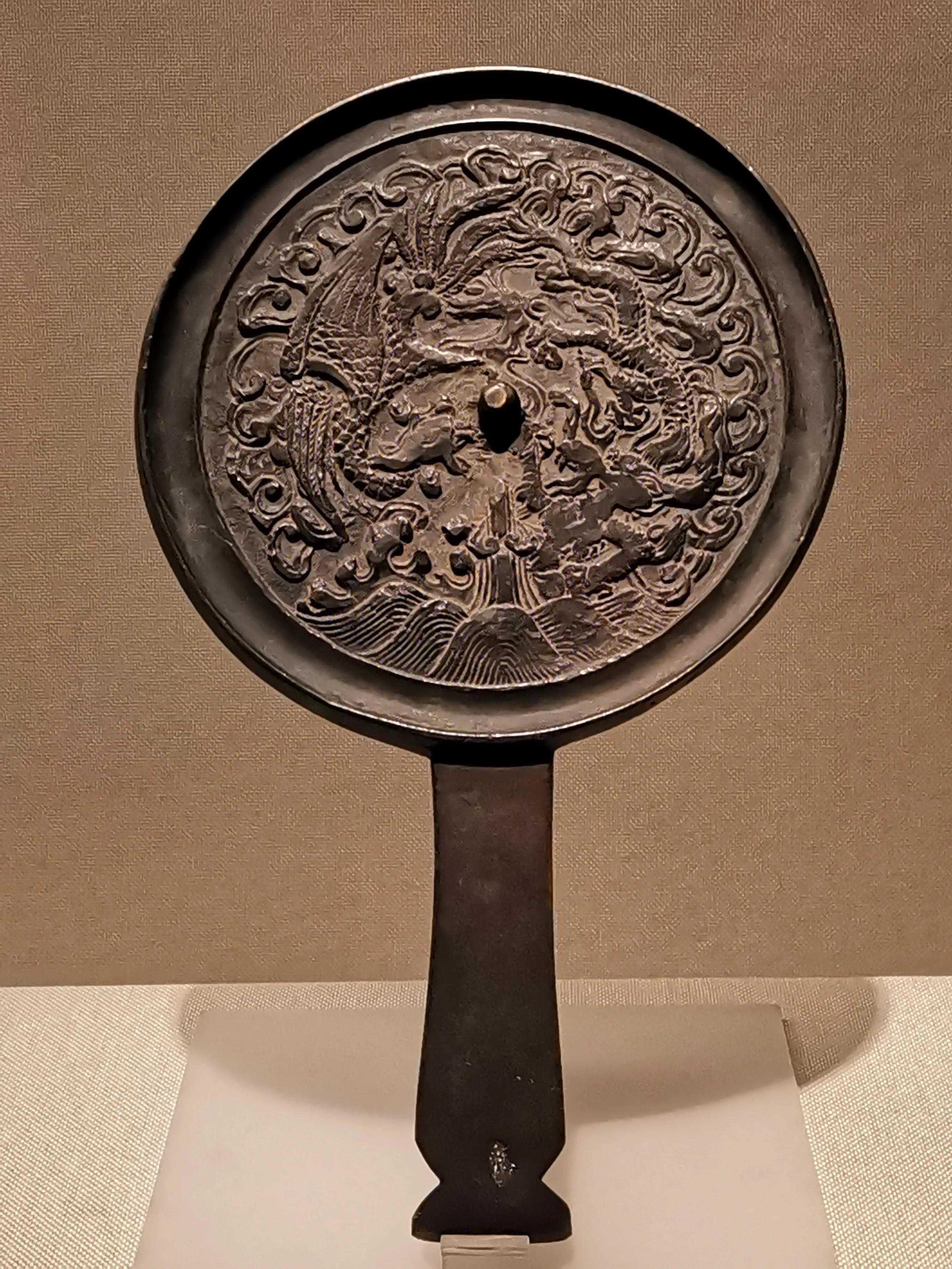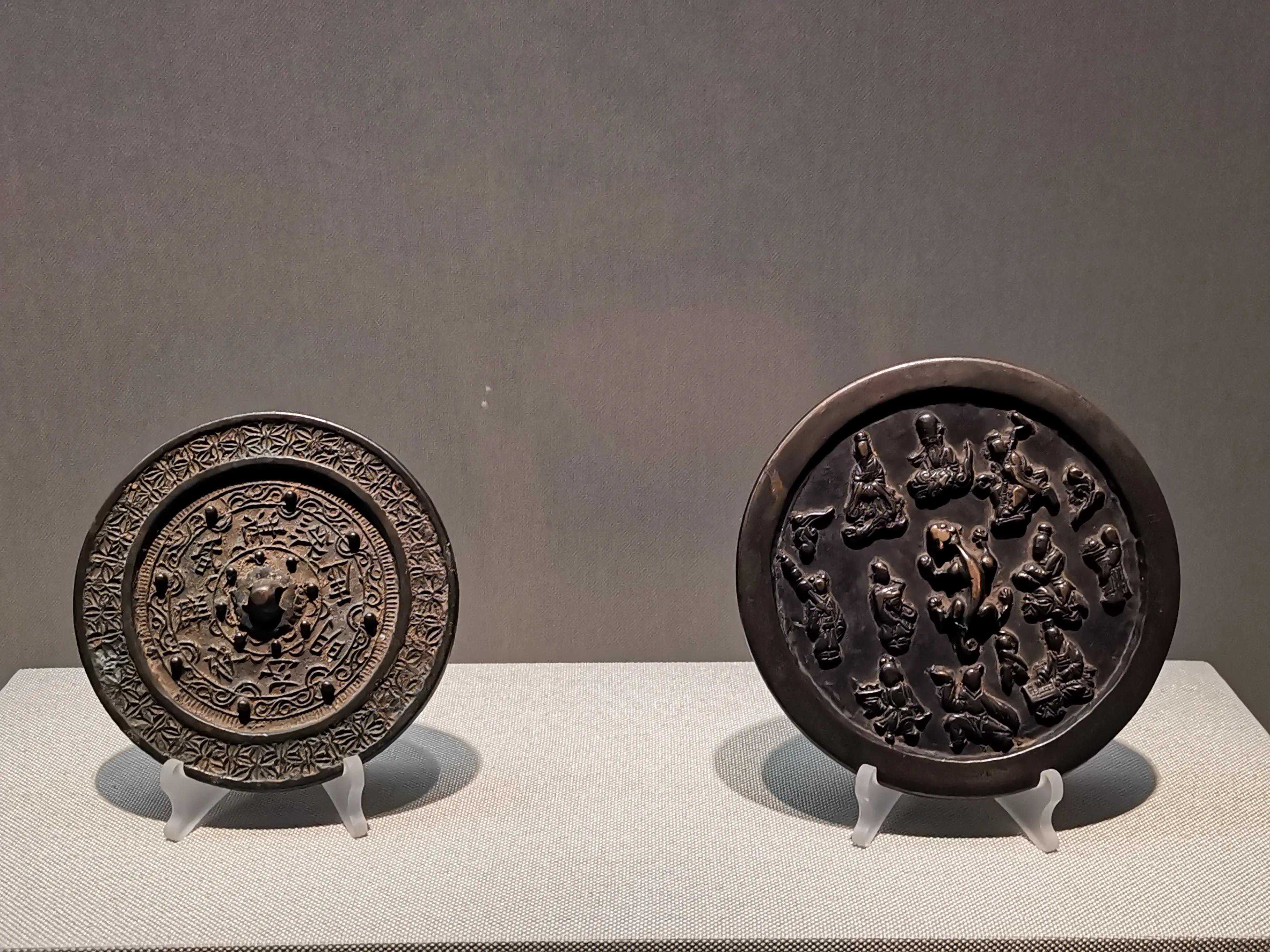唐代铜镜不仅突破了之前以圆为主的形式,出现了菱花、葵花、方形、亚形镜,而且纹饰也突破了汉镜的刻板及图案化,布局灵活多样,题材丰富多彩,且有异域人文色彩。花鸟菱花镜、瑞兽葡萄镜、人物故事镜等,都反映着盛唐的气派,突出一种繁荣的氛围,充满了盛唐欣欣向荣的生活气息。工艺方面还出现了金银平脱镜、螺钿镜、贴金贴银镜等,成为后世铜镜铸造所无法超越的又一个高峰。其中瑞兽葡萄纹镜又称海马葡萄镜、海兽葡萄镜、狻猊葡萄镜。流行于盛唐,多采用瑞兽、花鸟、葡萄等图案做装饰。葡萄是汉武帝时张骞出使西域带回中国,其图案已经出现在汉代丝织品上,唐代将其与瑞兽纹巧妙地结合在铜镜装饰上,突破了汉镜规矩的格局,呈现出包容万象、海纳百川的盛唐气象。唐代铜镜另一流行纹饰是双鸾镜,也称对凤镜,主题纹饰是双凤对舞,口衔绶带。绶是古代系官印的丝带,代表官秩禄位,配以吉祥的莲荷图案和具有瑞象的凤,应是世人求取功名的美好愿望。