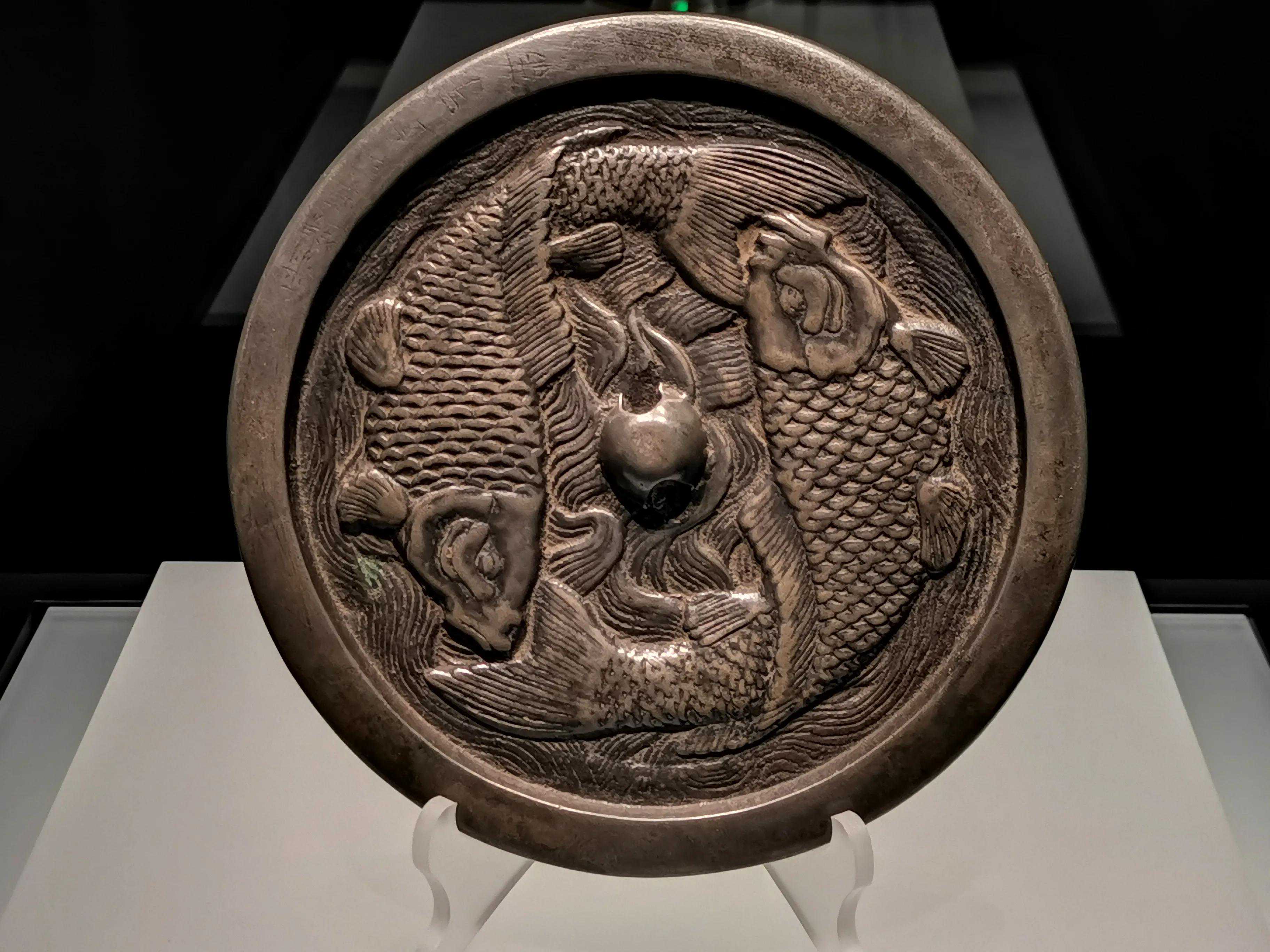 金代铜镜的主题纹饰非常丰富,其内容不仅有中原流行的图纹样式,也有反映本民族传统的内容,表现手法上也体现了本民族的特点,如金代的双鱼镜,采用浮雕的手法体现纹饰,给人以厚重的感觉,内容上也表现了女真人对渔猎习俗的执着。同时,金代的铜镜,无论是刻划双鱼、双龙、花枝或是人物、山石、树木,线条都比较粗犷,在看惯了宋镜的柔曼、纤弱之后,金代豪放的风格,令人耳目一新。由于金代战事频仍,官府对铜金属严格控制,大定十一年后严禁私铸铜镜,一律改为官铸,铜镜铸成之后要经过官方签押才能使用。因此,金代铜镜在镜缘处都有花押,很多沿用下来的唐宋辽镜也被打上了押记继续使用。
