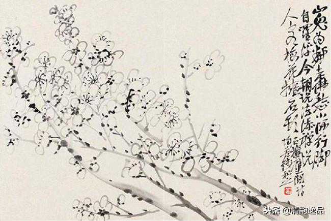 梅花对于吴昌硕来说具有极其特殊的意义。他一生种梅、赏梅、咏梅、画梅,去世前还立遗嘱命其三子将其葬于杭州超山宋梅亭畔,足见其对梅花的钟爱。吴昌硕一生作画万余,而以画梅花最多、最精,也最能表达其心意、技艺。他自谦云,三十学诗,五十学画,其实传世的作品中早年三十多岁时就画过梅花,四十以后梅花作品多见,这也表明他学画是从画梅花入手的。他在诗中写道:“卅年学画梅,颇具吃墨量。醉来气益粗,吐向苔纸上。……”也知其画梅花用功之勤。