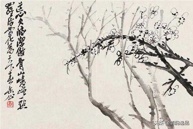 吴昌硕为诗书画印四绝艺术家,篆刻先成,助以石鼓文书法,得金石之气,具布置之巧,巧拙相生,以之入画,天然浑成。再加上他的诗作,可谓绝配。艺术家最难的是打通脉络,将书画印融为一体。在中国艺术史上,我们看到吴昌硕是融汇得最高明的一位。因此,每当我们欣赏他的画作,尤其是他的梅花,我们看到的不仅仅是绘画本身,我们还看到了他的书法,他的篆刻布局意趣,与其说他在画,更应当说他在写。正如他题画句:“是梅是篆了不问,白眼仰看萧寥天。”我们在欣赏他的作品,感受他的艺术思想,更是在理解他的人生。