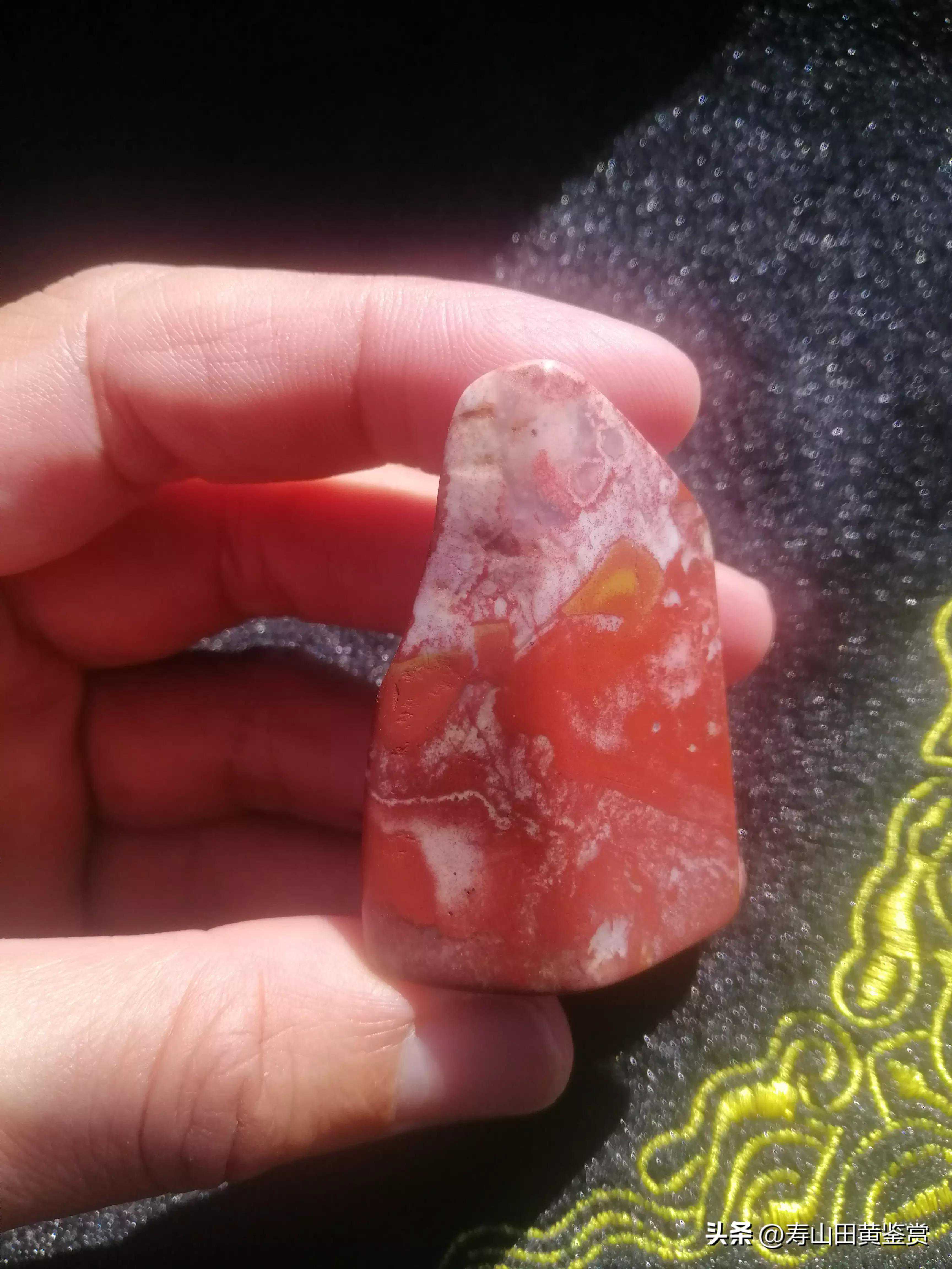 如上文所叙,其色红如荔枝,也有似乌枣之深红色,正好对照为寿山大红袍中有白色桃花冻地和黝黑牛角冻地两种表现。