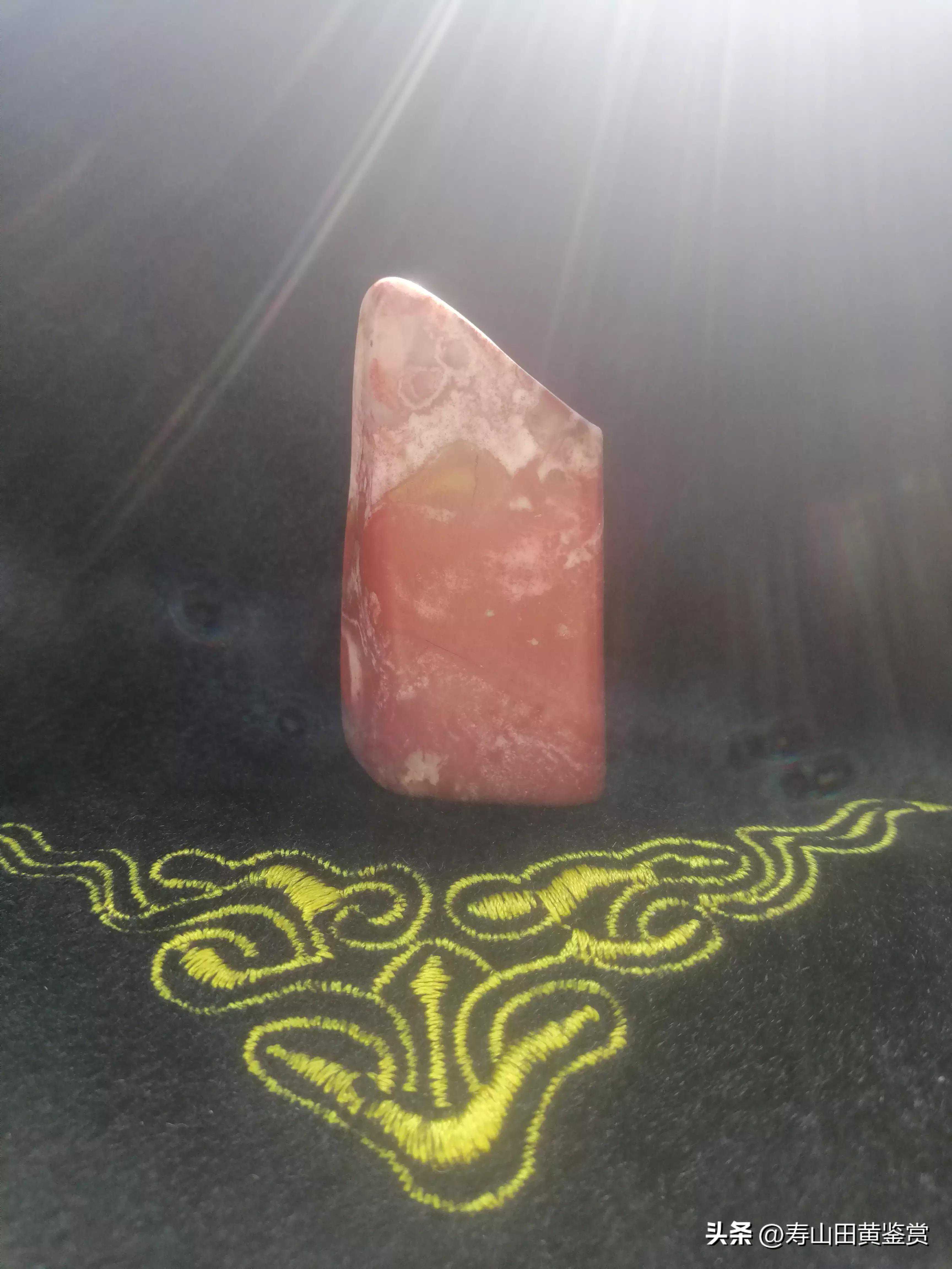 石性凝结通灵,色泽纹理以绛赭或酱红为主,表面条纹形云团状红色色块,如蕴含东来之紫气好运连连。石色浓艳不俗,古朴风雅,红斑块密集如披挂大红袍者尤为稀罕!本品为桃花冻地寿山大红袍间有淡黄、浅紫,粉白,赭黑等五彩纷呈,边界浓淡清晰,犹如红色彩龙翱翔于祥云之上变幻莫测,增添些许奇妙与神秘,大红袍的质感色彩符合中国人民传统的审美理念,历久弥新!