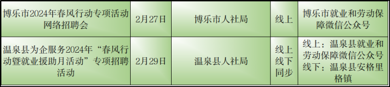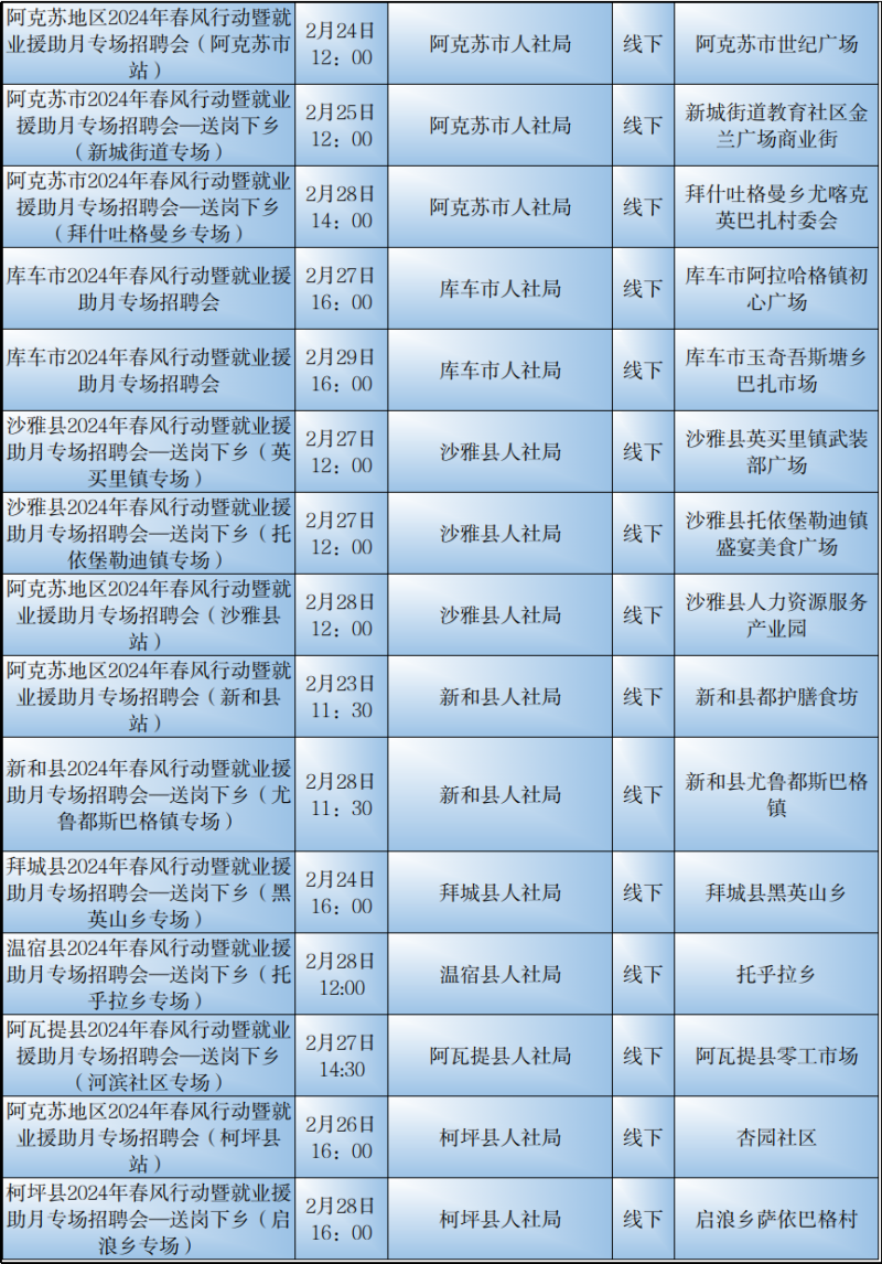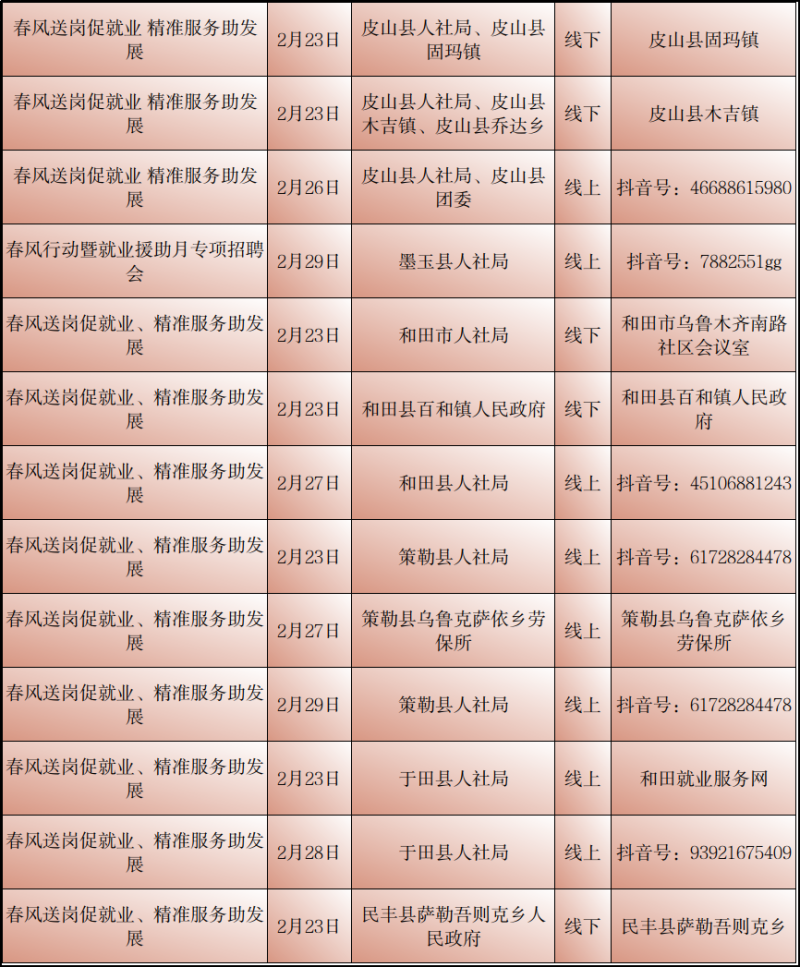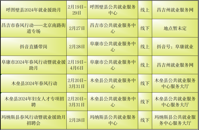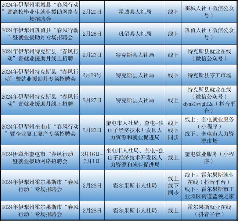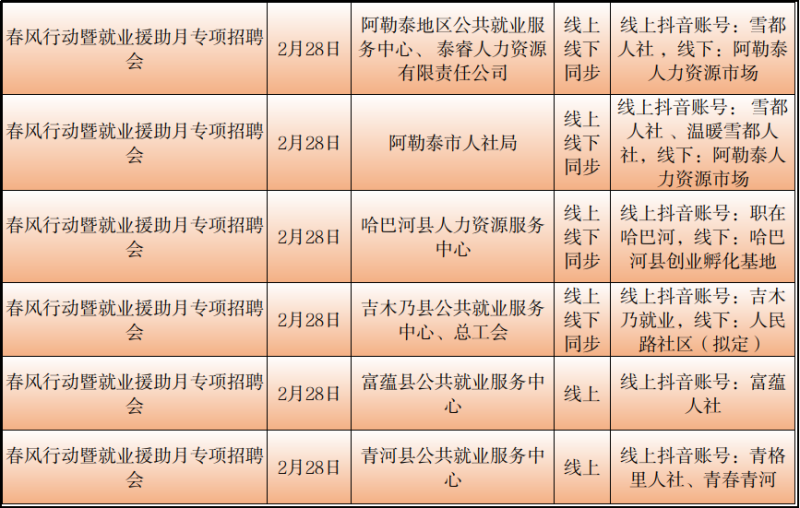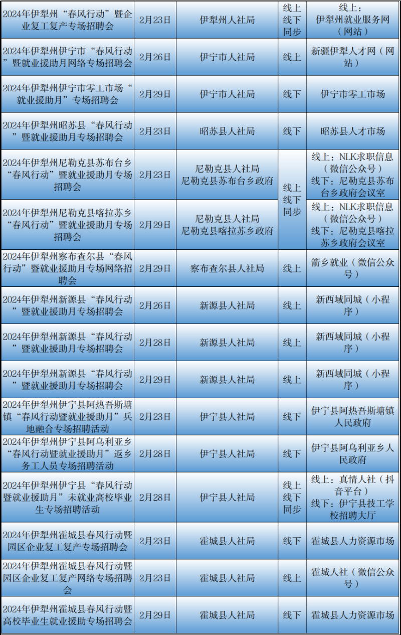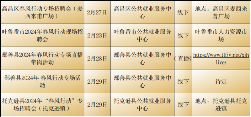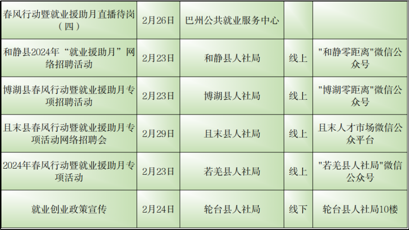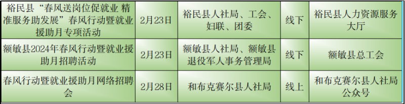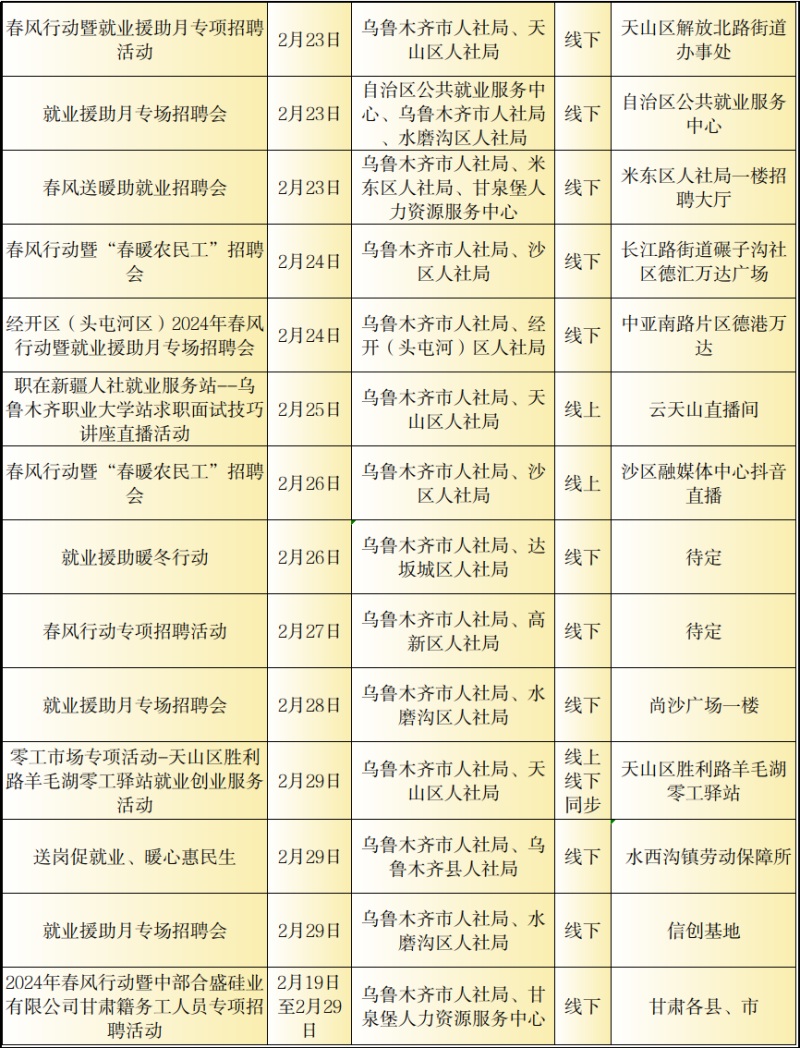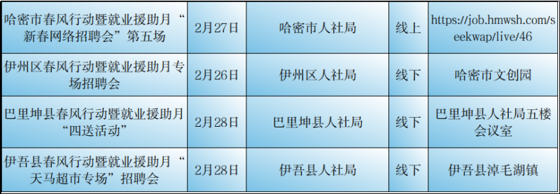 石榴云/(记者赵春华报道)2月23日,记者从自治区公共就业服务中心了解到,2月23日至29日,我区各级公共就业服务机构将密集举行“春风行动“暨就业援助月专项招聘活动,如果你想要找工作、换工作,那就千万别错过这些冒着“热气”的招聘活动哦!