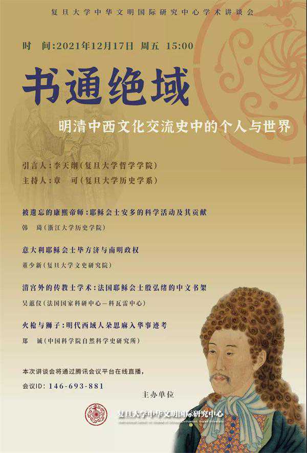 天地无用/整理书通绝域:明清中西文化交流史中的个人与世界时间:12月17日(周五)15:00地点:腾讯会议(ID:146693881)嘉宾:李天纲(复旦大学哲学学院宗教学系教授)、章可(复旦大学历史学......