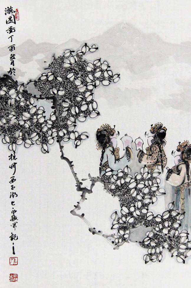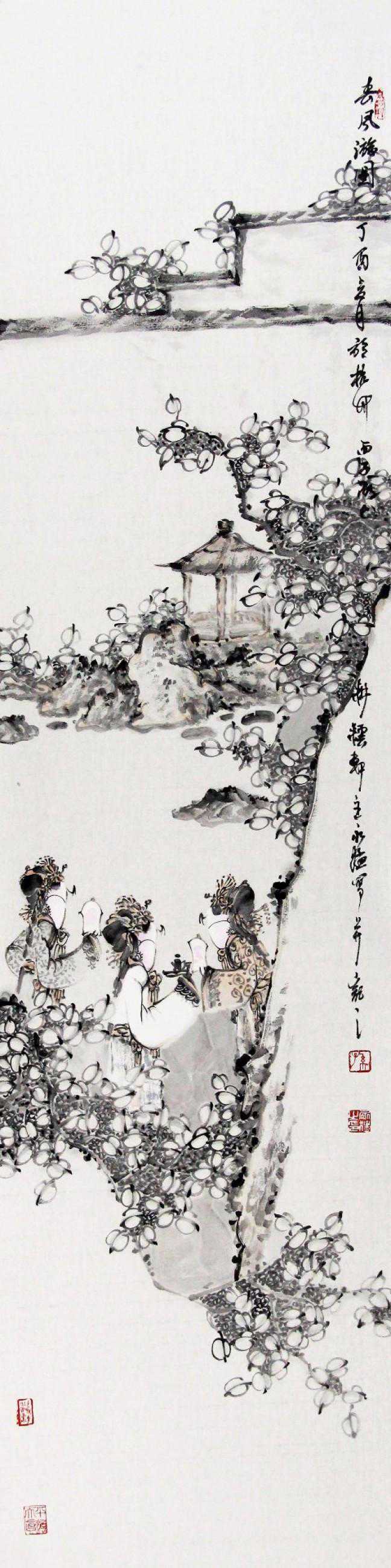 画家孙永猛的国画人物作品较多地吸收了民间艺术的营养,例如皮影戏的图像范式,以符号式的技法形式营造出属于自己的那种绘画语言,他运用了这种语言来扩写自己的情意,并不断地在进行属于个人方式的调适,进而找到新的融合点。画家对生活观察精细,造型技巧熟练精准,在把握整个画面的布局、构图、节奏上处理都非常到位。这幅《春风游园》,画家洒脱的笔触,俊逸的风采,表现出园林美景与人物的古典之美,有着一种全新的艺术味道。作品构图严谨,笔墨精简,生动传神,带给观赏者美的艺术享受。