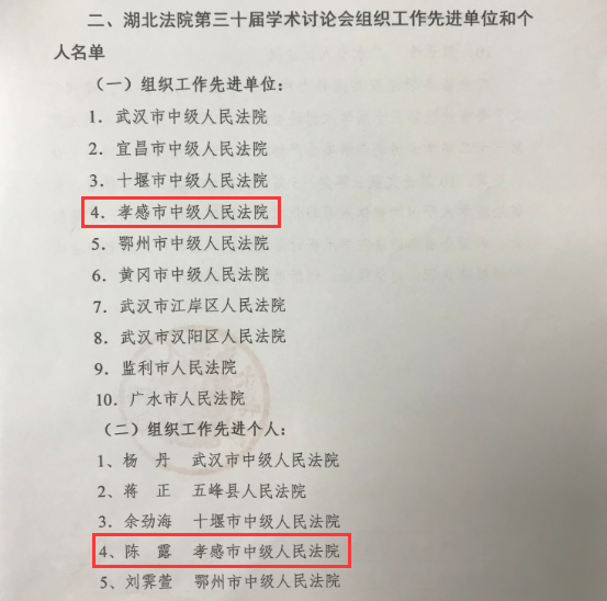 近日,省高院下发《关于全省法院第三十届学术讨论会论文评选结果的通报》,孝感中院被评为“全省法院第三十届学术讨论会组织工作先进单位”,孝感中院干警陈露被评为“组织工作先进个人”。两级法院1篇论文获得一等奖,1篇论文获得三等奖,3篇论文获得优秀奖。