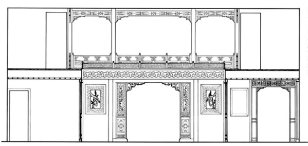 乾隆朝继承了雍正朝的工艺传统,又将斑竹工艺运用到了内檐装修的制作中。养心殿西暖阁后部由仙楼围合而成的一个供奉佛塔的空间,东墙与西墙仙楼下各有一槽嵌扇,嵌扇的南北墙上各安置了一扇方窗,南面仙楼下面安设有一槽落地罩,落地罩东西墙上也各安置一扇方窗: