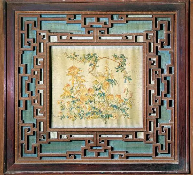 宁寿宫颐和轩内有一扇紫檀木方窗,窗心花纹用棂条拼成回纹框,框内用竹丝拼接成小回纹镶嵌在棂条上,作为边框的装饰,窗心夹花草图案窗纱: