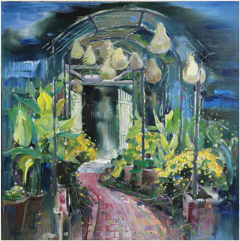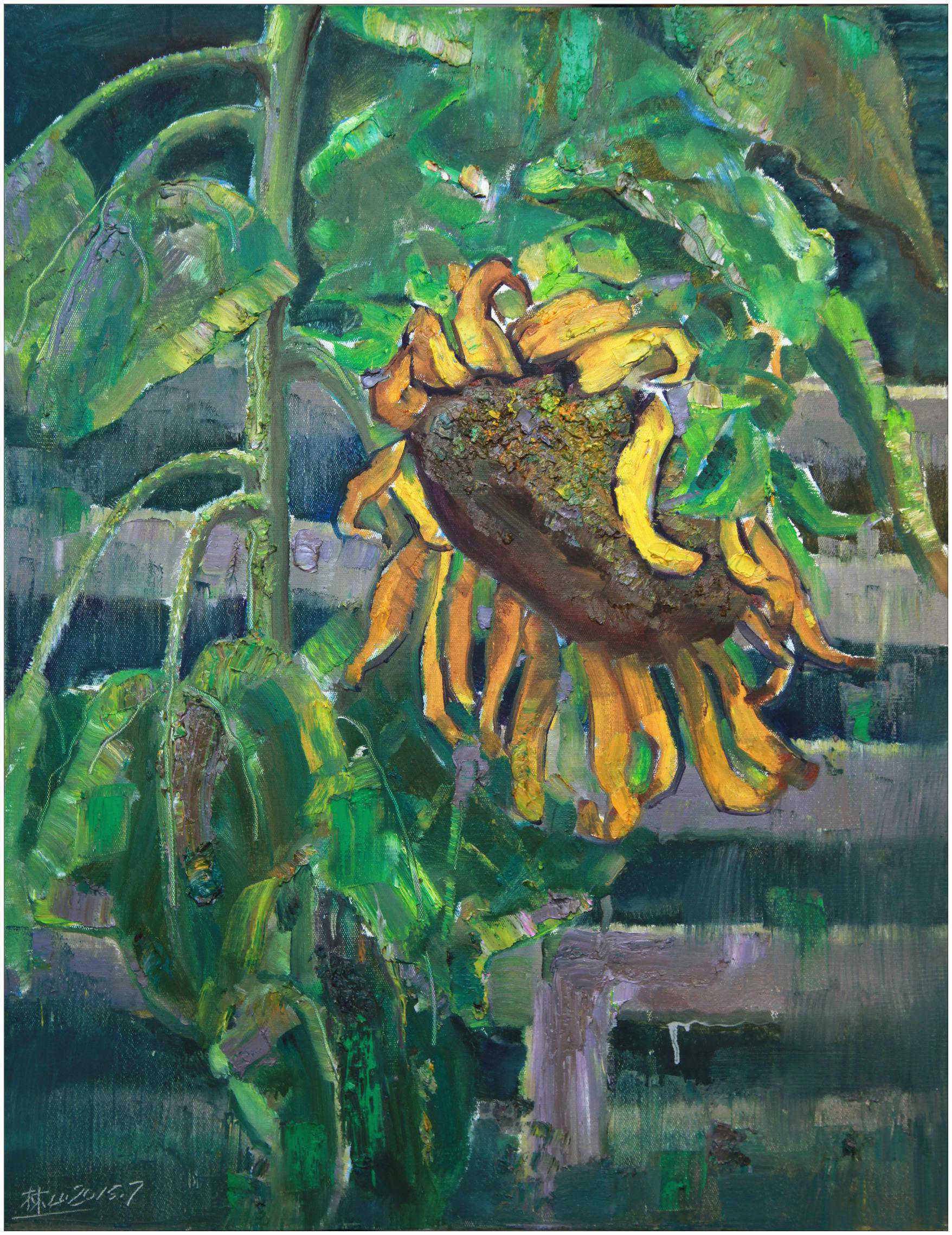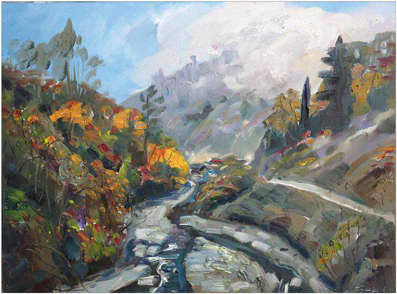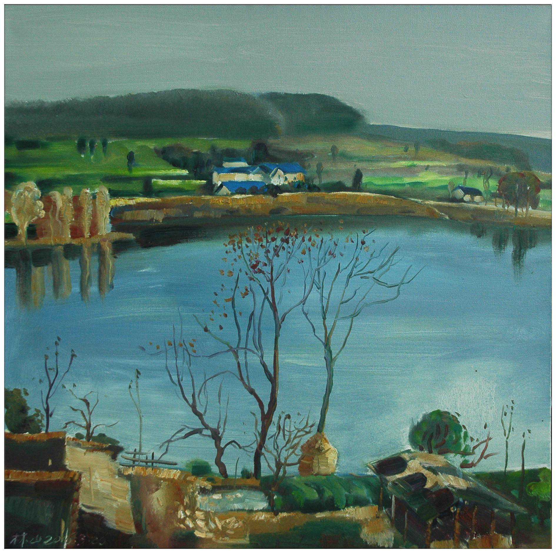 其实不管林山先生的画风是传统写实是印象派还是其他,在我看来,他的画作里始终有一种浓厚的乡土情结。虽然长期居住在绵阳这个中等城市,但画家笔下少有现代工业文明和城市文明造就的美,更多的是朴实甚至有些粗糙土气的乡村景色。比如油画作品《安县马鞍村春意浓》《北川片口》《永兴红房子之一》等。作者用浓墨重彩为我们描绘了一幅幅质朴无华的乡野画卷。那一湾清幽幽的碧水、那一株枝干粗糙宛如老父亲的手一般的老梨树、山后那株如新嫁娘一般红艳艳的桃花、门前那棵果实饱满头颅低垂的向日葵…是我们似曾相识的故土和家园,也是我们终身挥之不去的乡愁。