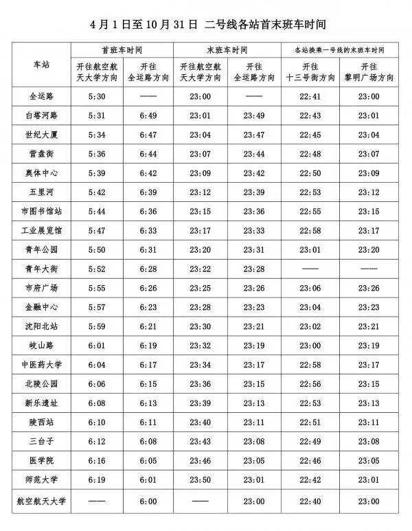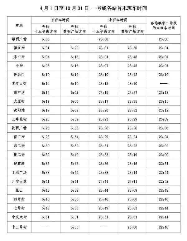 自4月1日起至10月31日止,一、二号线双向运营末班车发车时间将由22点20分调整为23点,首班车时间不变。